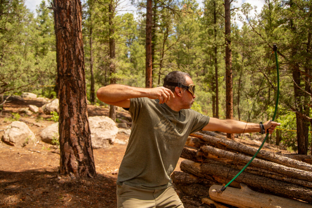 Archery Tag is everything you think it’d be; launch arrows at your pals in the woods (don’t worry — the tips are cushiony soft foam)! For real though, it’s a great time to chase your friends in the woods with bows and arrows! The rush of the hunt, the smell of the pine, the *THWANG* of the bow string; it really is very immersive! We also have a wide variety of games to offer. Come on out and play some “Swords Shields” with our bows and arrows; it’s a blast!