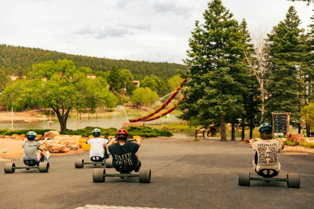 Big wheels and big drifts galore! There’s an unbelievably surprising amount of fun to be had with the drift trikes! Once you put the helmet on and touch the trike, you can’t help but get giddy and feel like a kid, no matter the age! You just hop on the trike and ride; but the twist is that wheels are specially made with less tread, so you spin out on them and hit a sick drift! Once you’re done going down the big hill we have, you can take it to the next level. Grab a soccer ball and mobile goal post and you’ve got a Drift Ball! Or even a basketball and a court! Then you’re out on the court, drift around people, taking shots at goals, and having an absolute ball of a time!