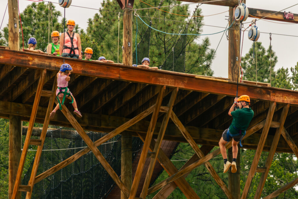 Derring-dos and thrill seekers alike, we give you the Zip Drop! The Zip Drop is our most exciting activity on our base camp (aside from the High Five, of course)! Most ziplines are metal cables with a trolley attached for a great time across a gorge. But the Zip Drop combines the out with the down! Participants are hooked into an Auto Belay which is attached to a zipline trolley! Meaning, as you step off the platform, you glide across our field below and are lowered onto it! This one is for the strong of heart, and it’s oh so worth it!