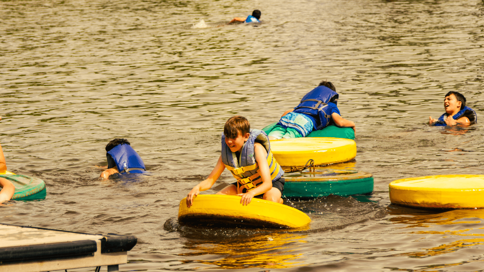 Our waterfront is the perfect place to relax, play, and enjoy time by the water during your stay at camp. This is a shared camp space used by multiple programs, creating a fun and lively atmosphere throughout the day. There are always lifeguards on duty, so families can safely enjoy all the waterfront has to offer.
